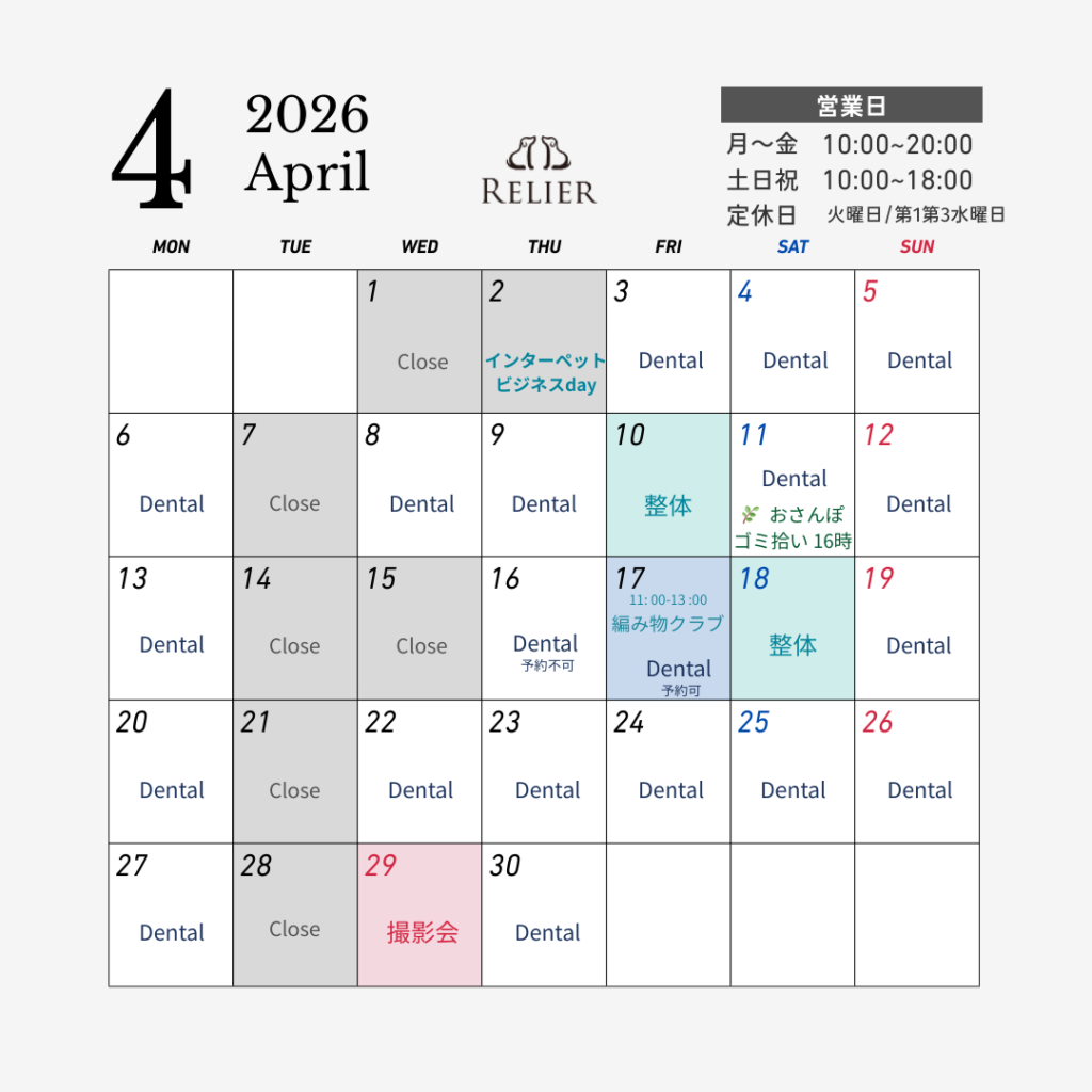 2026年4月 営業カレンダー|横浜RELIER(ルリエドッグサロン